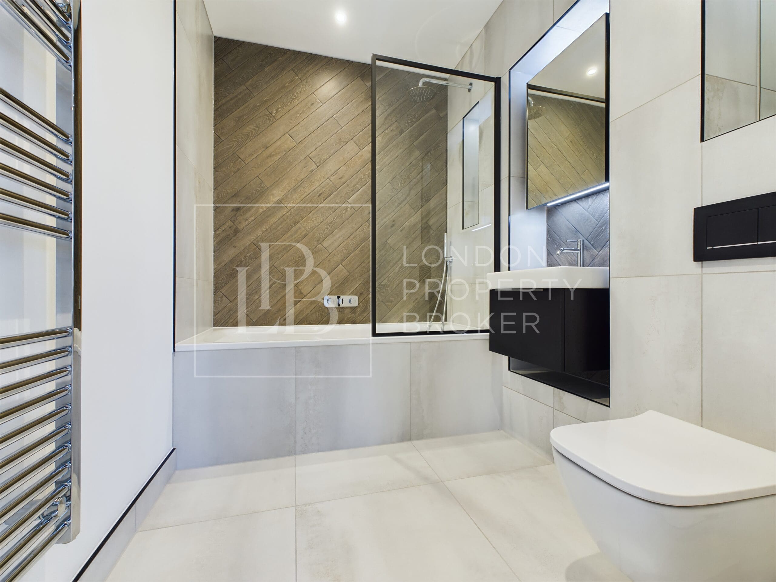 Both bedrooms are well proportioned, finished with either plush carpet or contemporary flooring, built-in wardrobes, and a soothing neutral palette. The principal bathroom impresses with a walk-in shower, elegant blue tiling, a floating vanity, and a wall-mounted WC for a streamlined finish.
