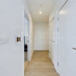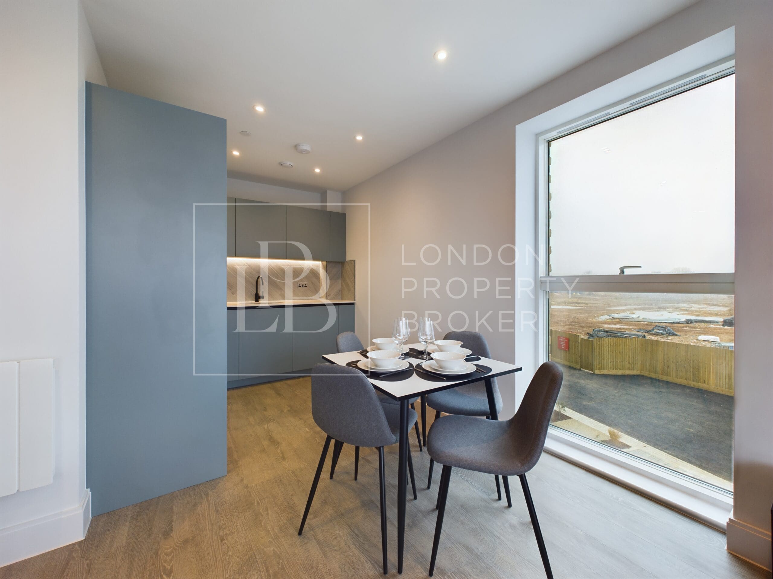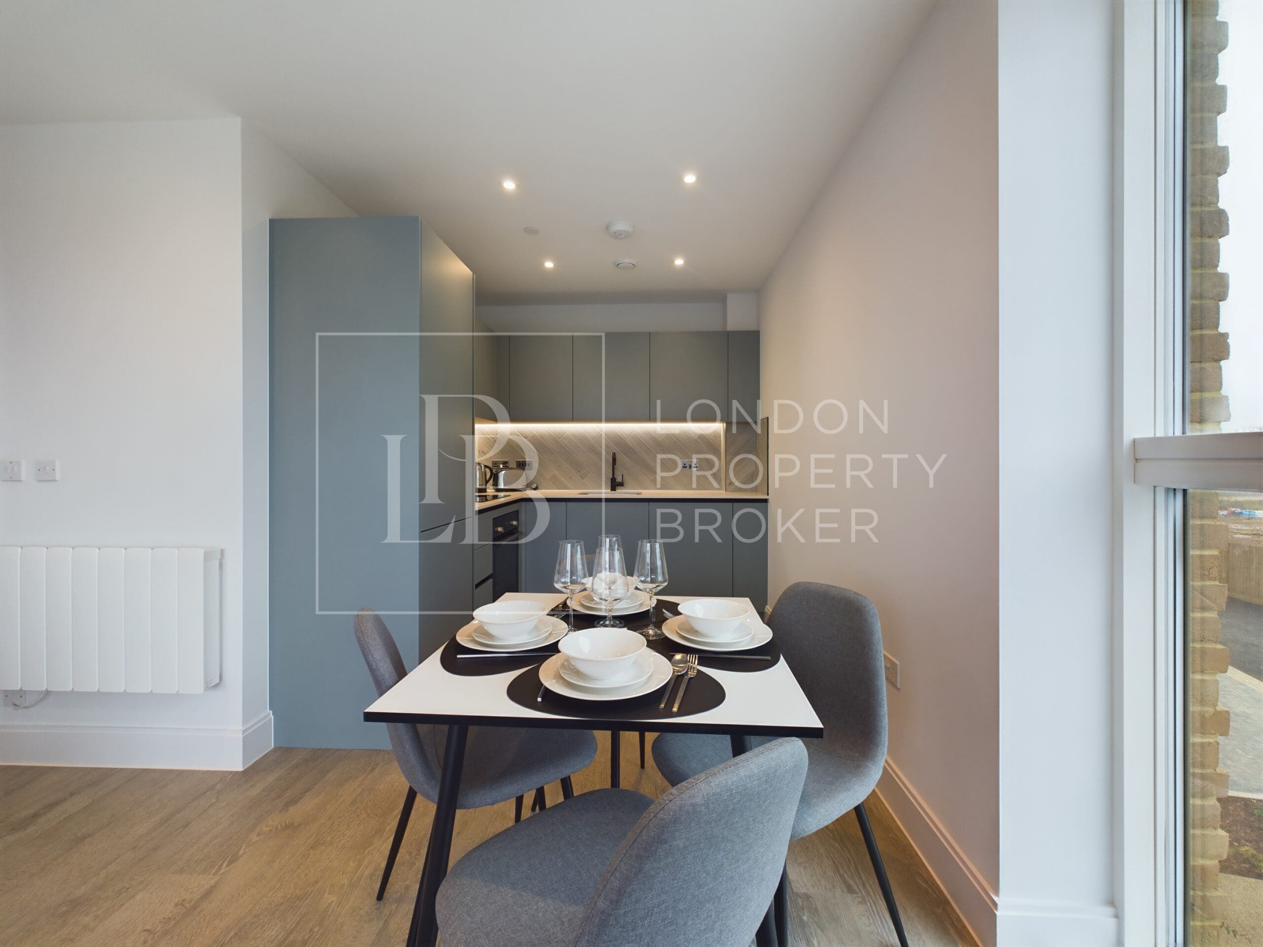 At the heart of the home is a bright open-plan living area, where a modern kitchen with sleek cabinetry, integrated appliances, and a striking subway-tile backsplash flows effortlessly into the generous reception space. Expansive windows bathe the rooms in natural light, enhanced by modern flooring and neutral décor to create a fresh, welcoming atmosphere.