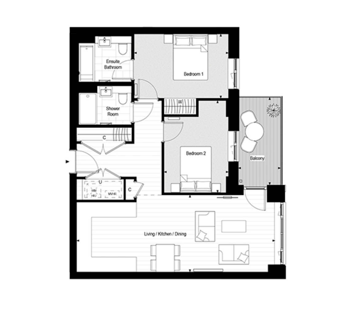 Both bedrooms are generously sized and feature built-in storage, while the two modern bathrooms are finished to a high contemporary standard, including an en-suite for the principal bedroom.