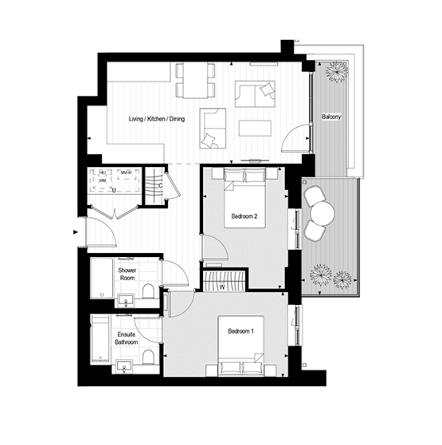 The principal bedroom boasts an elegant en-suite bathroom and built-in wardrobes, while the second double bedroom provides ample space for guests or a home office. A second contemporary bathroom completes the apartment, finished to an exceptional standard.