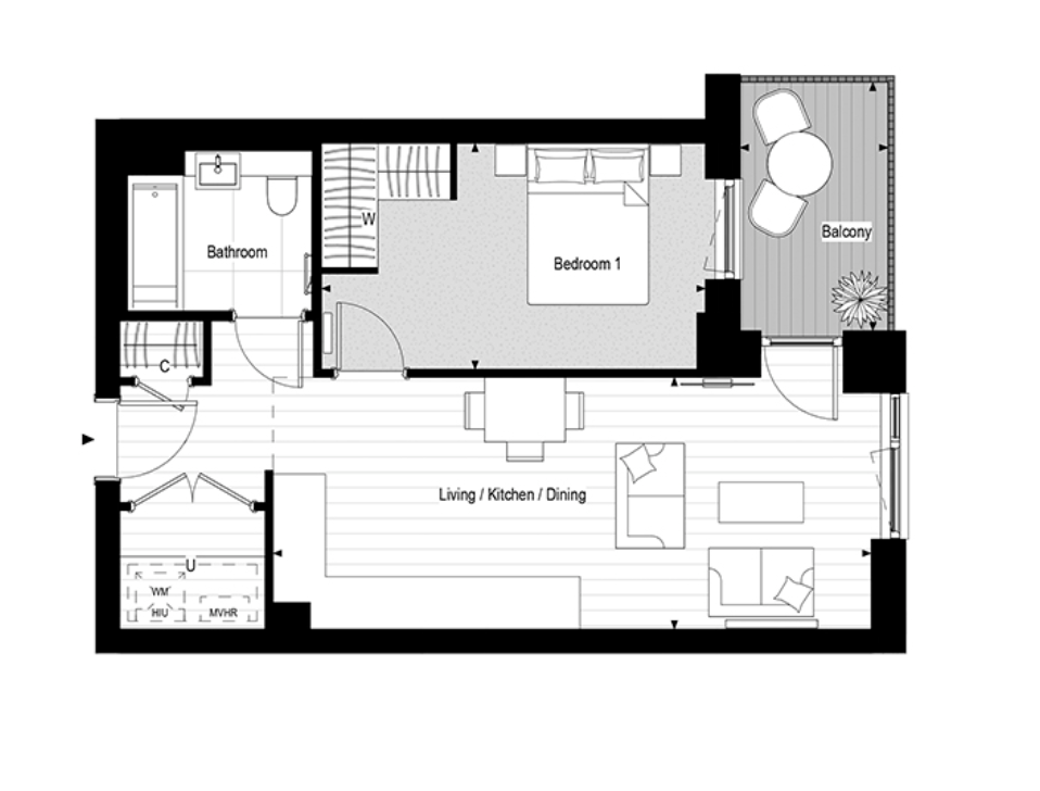 Bright open plan living area with premium finishes and access to a private balcony